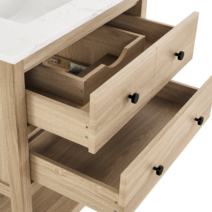 Storage includes two U-shaped soft-closing drawers that work around plumbing to maximize space, plus an open lower shelf for towels or baskets. Matte black handles provide a clean, contemporary accent. Adjustable feet ensure a level stance on uneven flooring, while the faucet-ready top allows you to choose your preferred fixture.