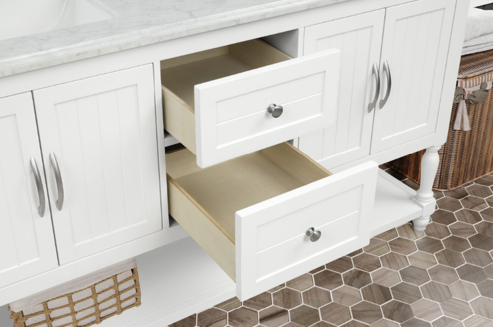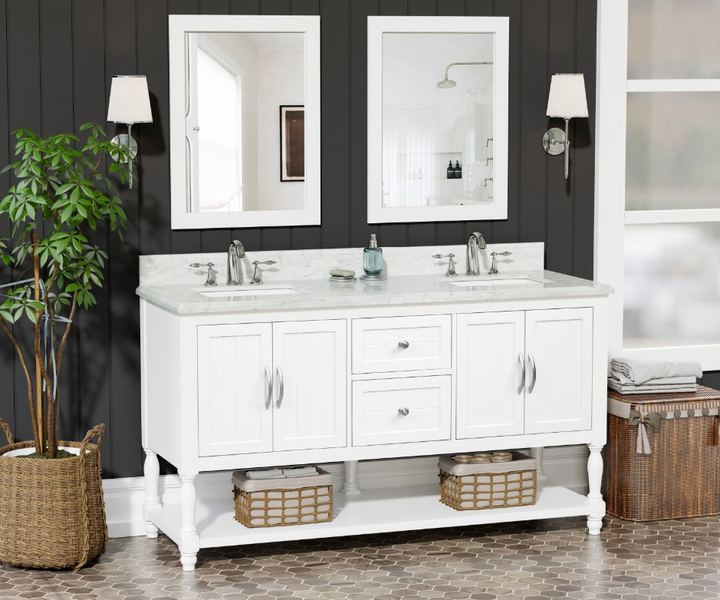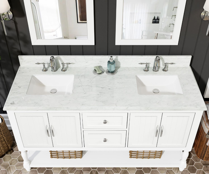 Bring timeless sophistication to your bathroom with the Camden 60" Bathroom Vanity, expertly crafted with a solid wood frame and finished in clean, bright white paint. Topped with a luxurious 1" thick premium Carrara natural marble countertop and a 4" high backsplash, this vanity delivers lasting beauty and functionality in one refined centerpiece. (For vanity combos, the countertop is typically 1 inch wider than the base—about 0.5 inch overhang on each side. This standard design ensures a proper fit and finished look.)