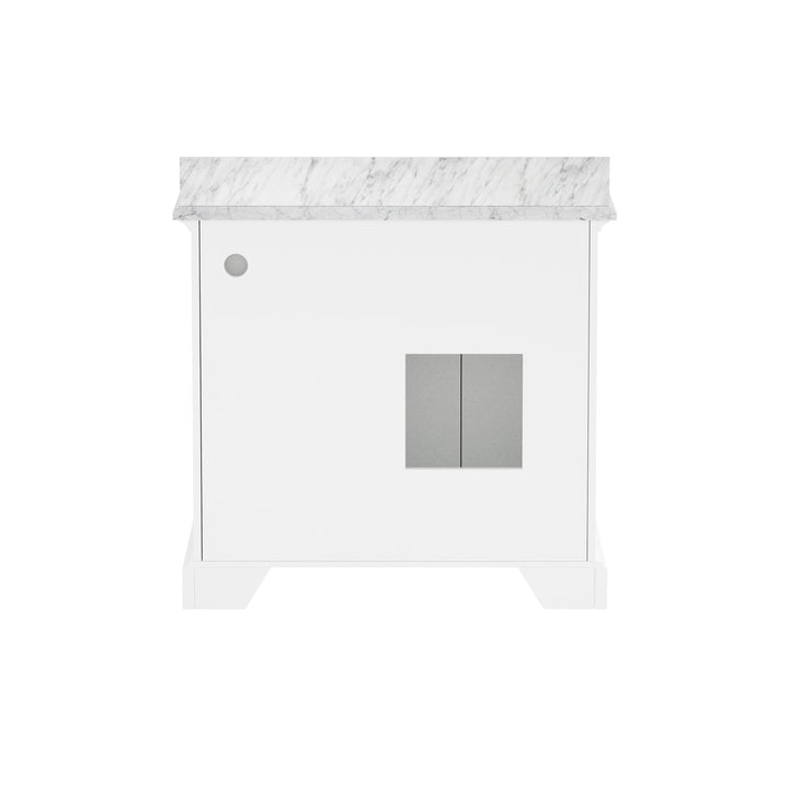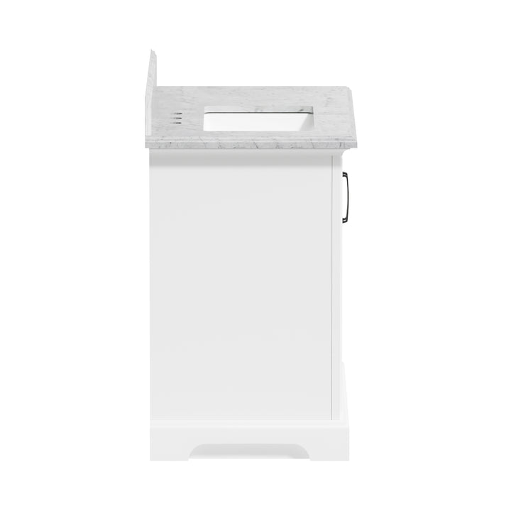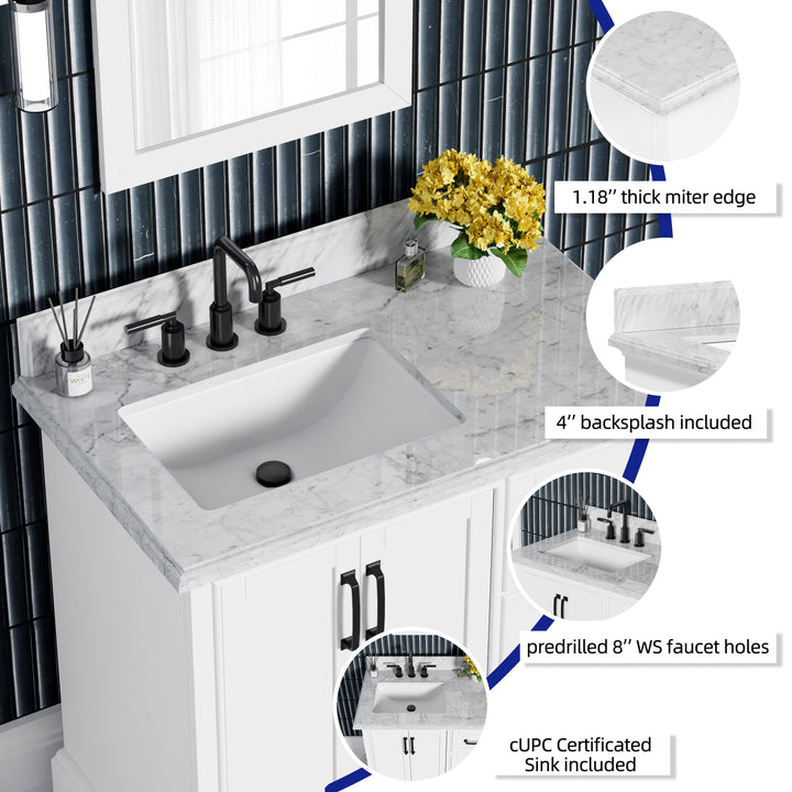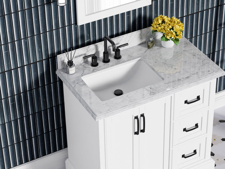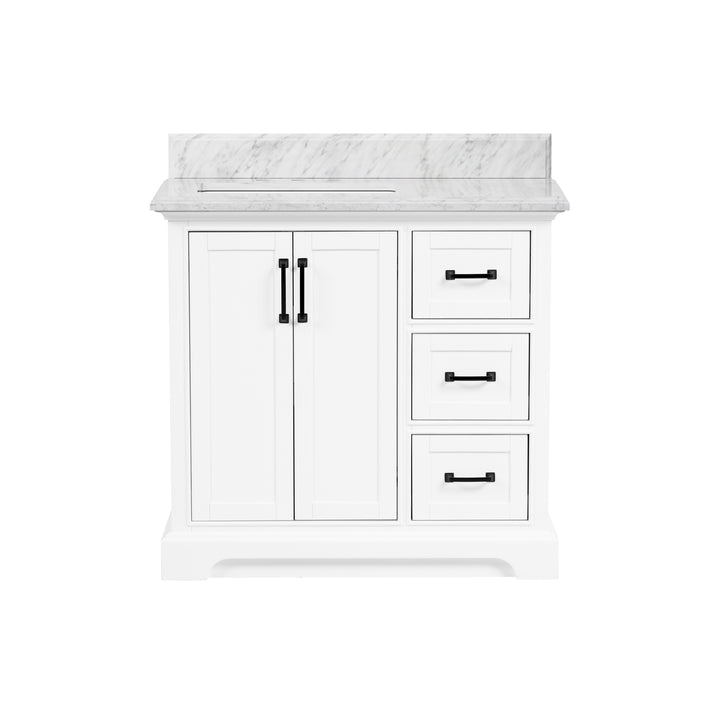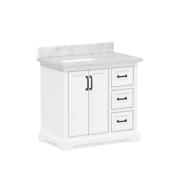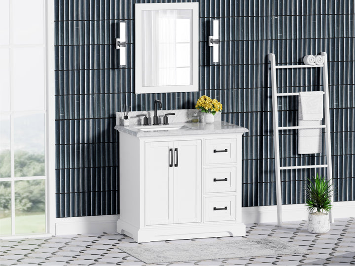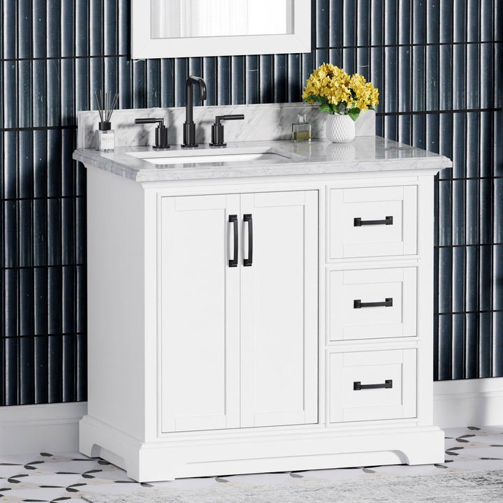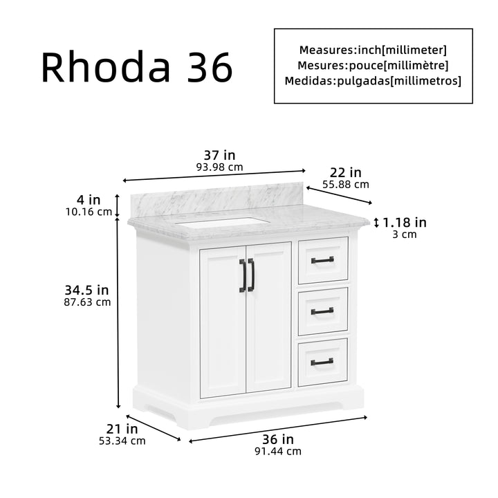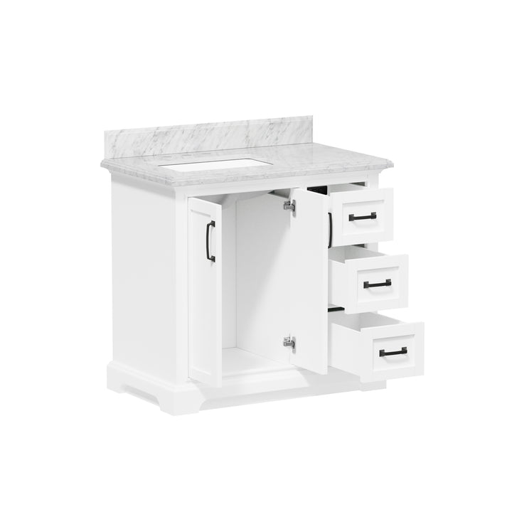 Upgrade your bathroom with the perfect combination of timeless beauty and everyday functionality. The Rhoda 36" Single Bathroom Vanity features a natural Carrara white marble top and a solid wood frame finished in a clean, bright white paint, creating a refined focal point for transitional and contemporary spaces alike.