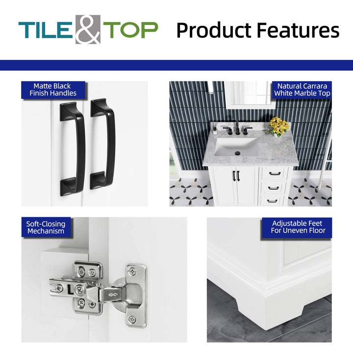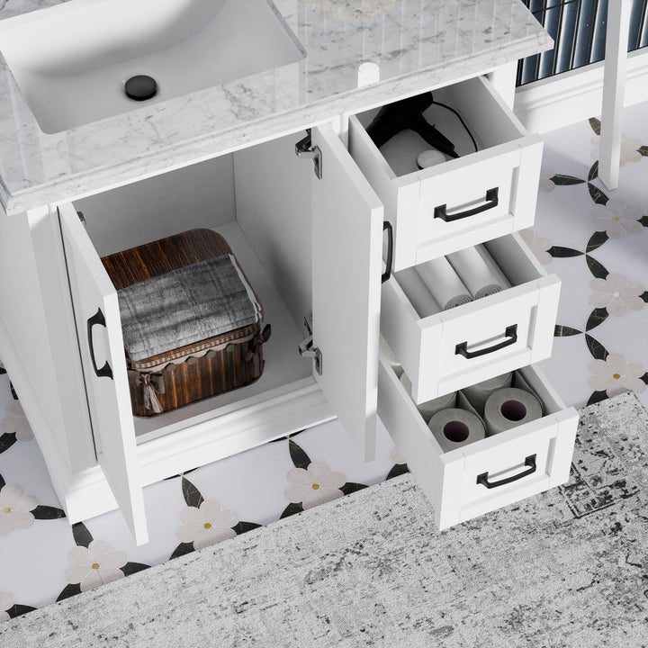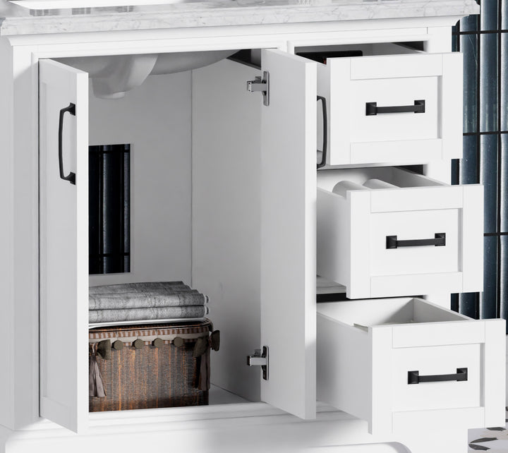 Designed for both form and function, this vanity includes three soft-closing drawers and two soft-closing doors, offering generous, organized storage. Finished with matte black handles for modern contrast and adjustable leveling feet for installation on uneven floors.