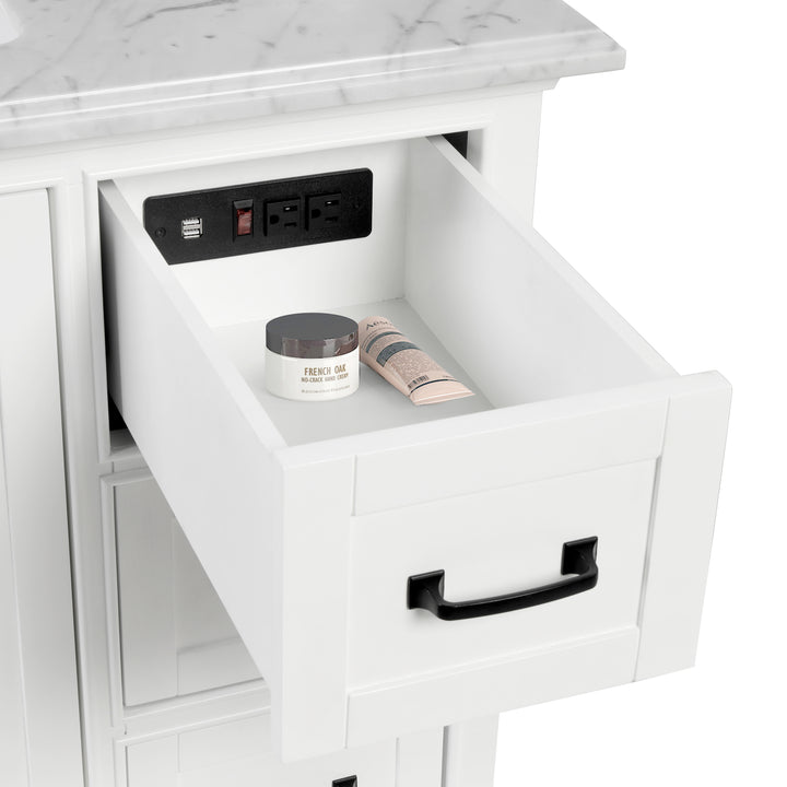 The premium Carrara marble countertop offers classic elegance with delicate gray veining, while the 4" backsplash provides added protection and a polished look. (For vanity combos, the countertop is typically 1 inch wider than the base—about 0.5 inch overhang on each side. This standard design ensures a proper fit and a finished look.) Inside, the vanity is equipped with built-in power outlets and USB ports, allowing you to charge devices or use grooming tools with ease, all while keeping cords neatly out of sight.