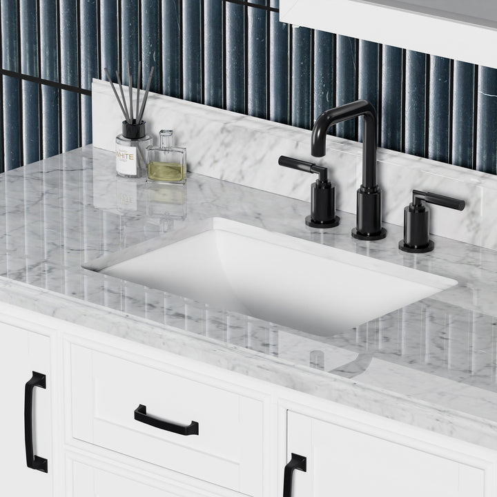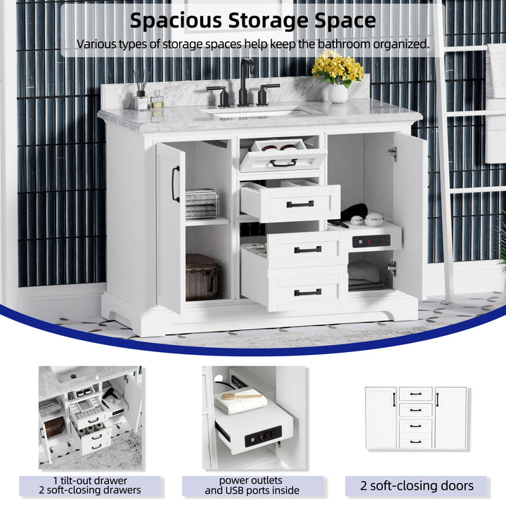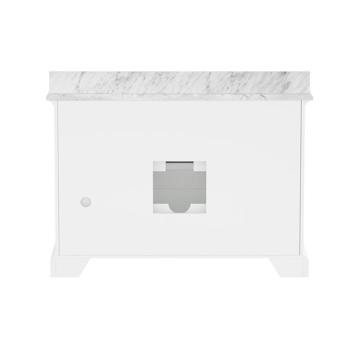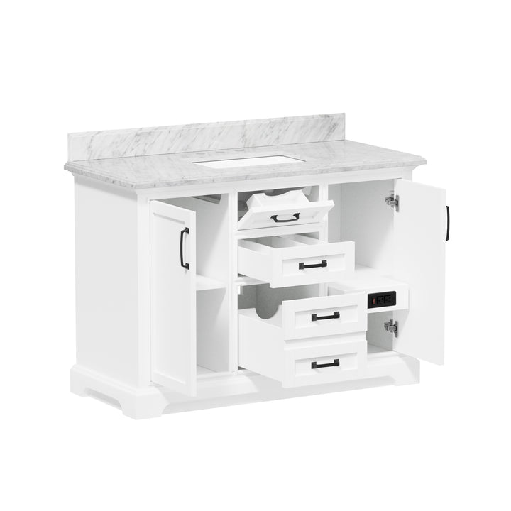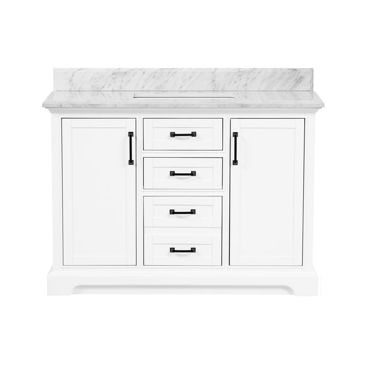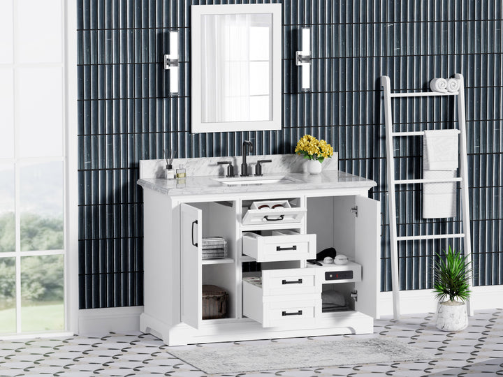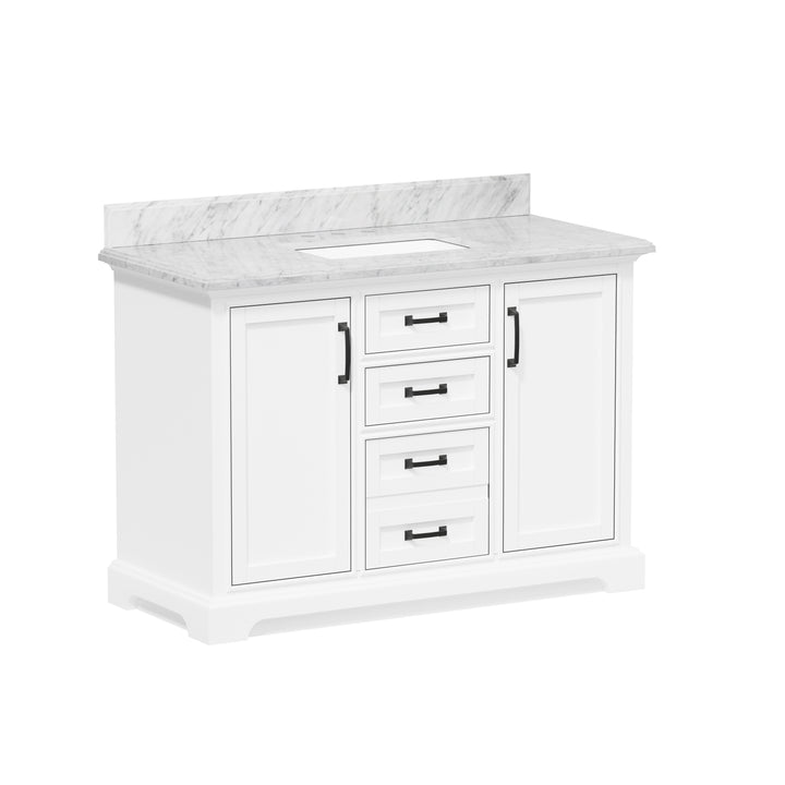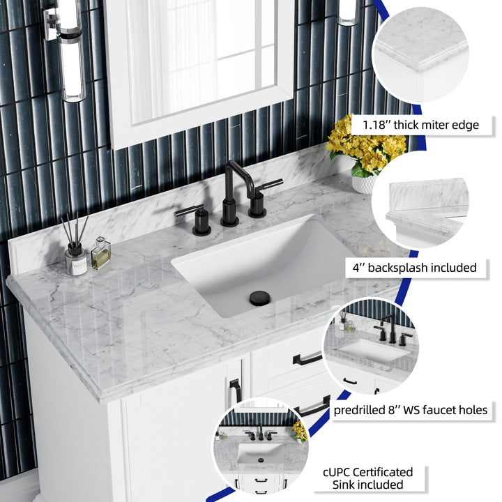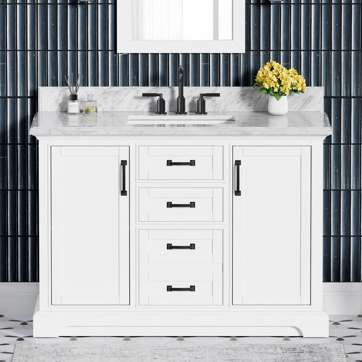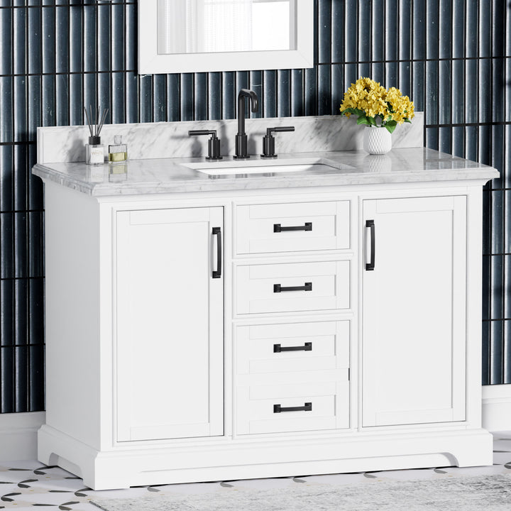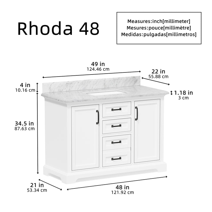 Blend timeless elegance with cutting-edge functionality in your bathroom with the Rhoda 48" Single Bathroom Vanity. Finished in crisp white paint and constructed from a durable solid wood frame, this spacious vanity is topped with genuine natural Carrara white marble, complete with soft veining and a 4" high backsplash for a refined, enduring look. (For vanity combos, the countertop is typically 1 inch wider than the base—about 0.5 inch overhang on each side. This standard design ensures a proper fit and a finished look.)