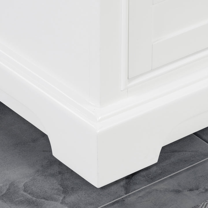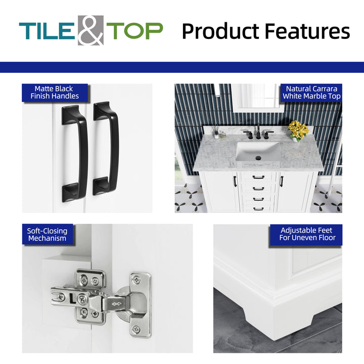 Matte black handles add modern contrast to the classic white finish, while adjustable leveling feet ensure a stable setup even on uneven flooring. Faucet not included, allowing for personalized selection.