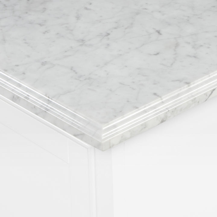 Countertop: Natural Carrara white marble with 4" backsplash – luxurious and timeless