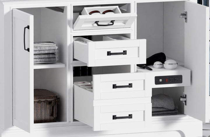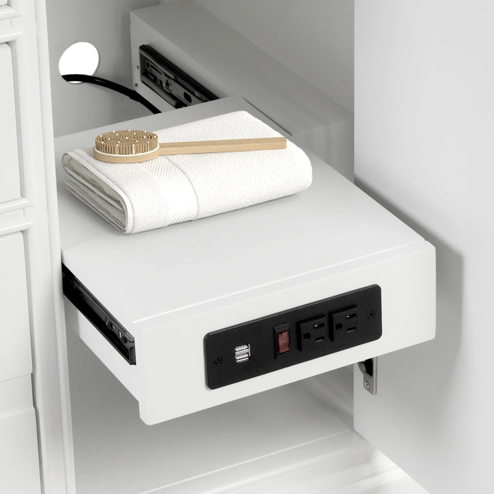 This model is thoughtfully equipped with smart built-in power outlets and USB ports inside the cabinet—perfect for charging grooming tools, phones, or accessories while keeping cords neatly tucked away. Storage is abundant, with two soft-closing drawers, a tilt-out top drawer for easy-access items, and two soft-closing doors for concealed storage.