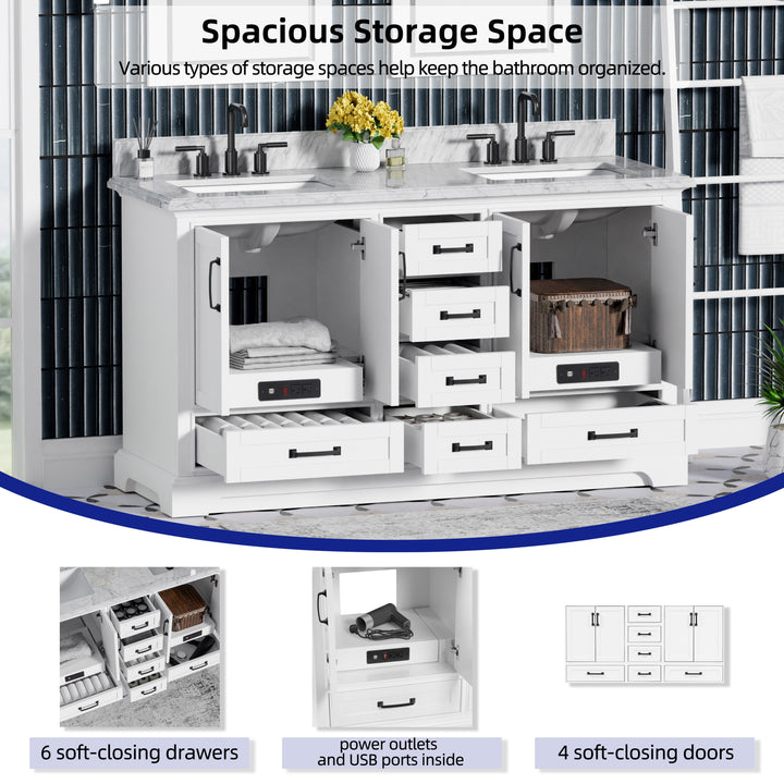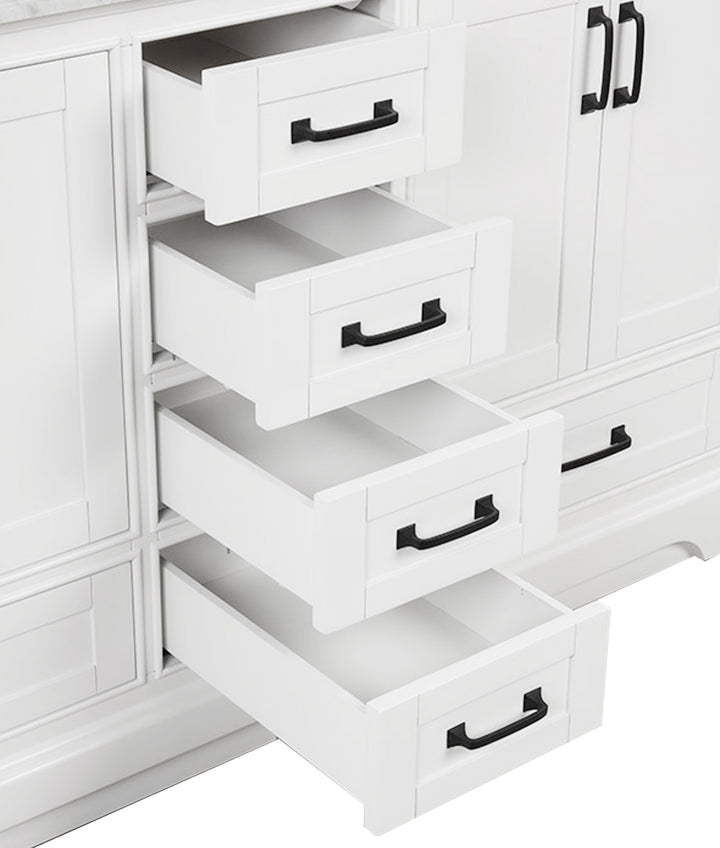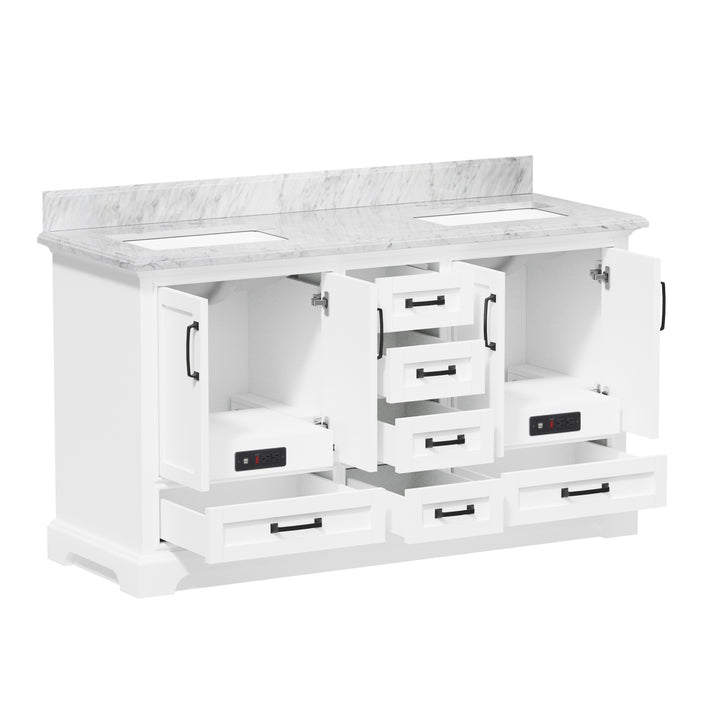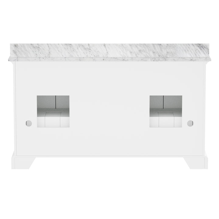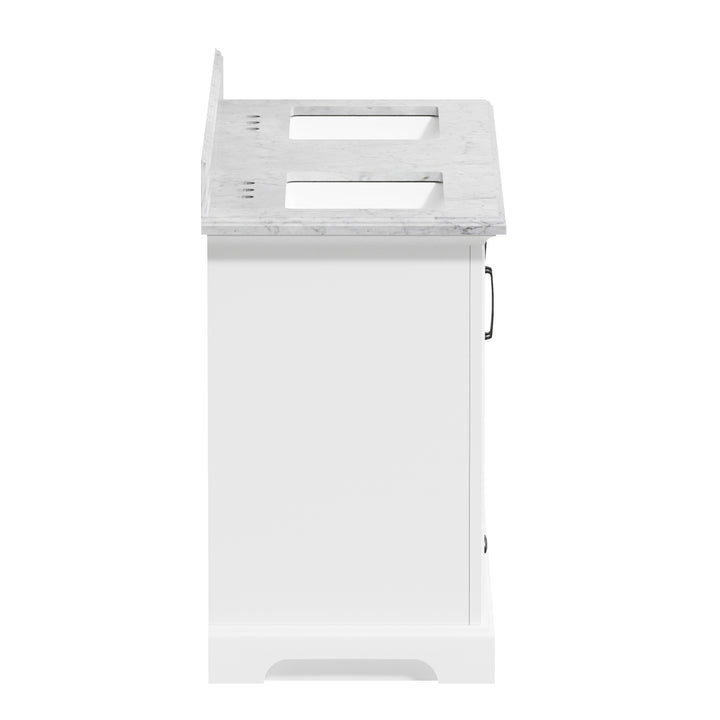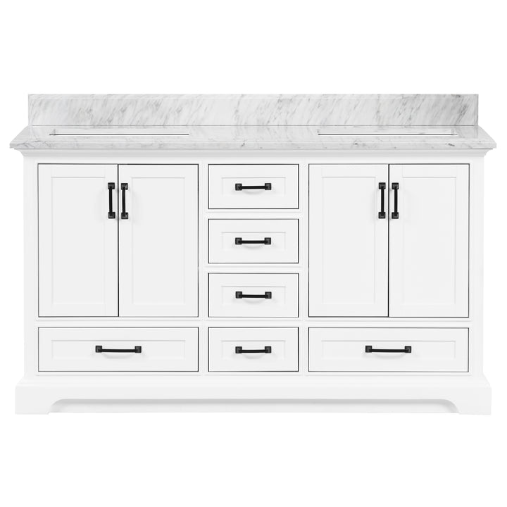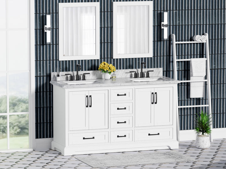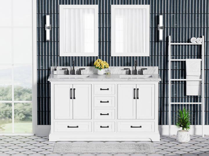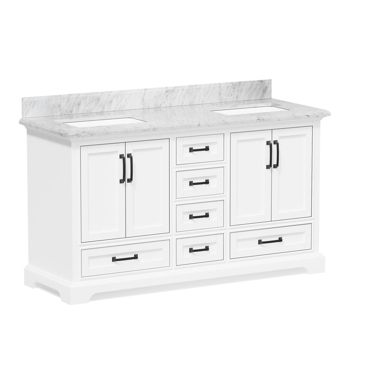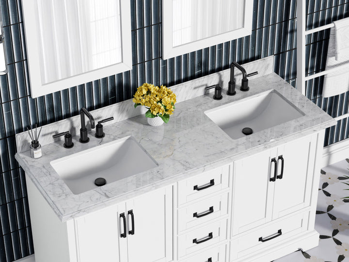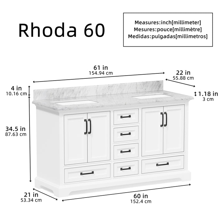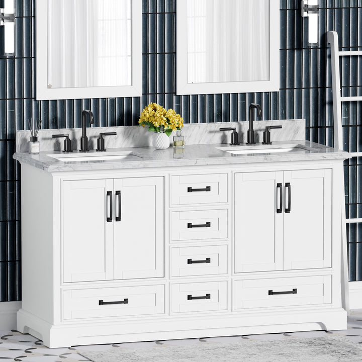 Make a bold, refined statement in your primary bathroom with the Rhoda 60" Double Bathroom Vanity, a masterful blend of premium materials and smart design. Crafted from a sturdy solid wood frame and finished in timeless white paint, this expansive vanity is crowned with an elegant natural Carrara white marble top, showcasing soft gray veining and a polished surface that enhances any upscale interior. (For vanity combos, the countertop is typically 1 inch wider than the base—about 0.5 inch overhang on each side. This standard design ensures a proper fit and finished look.)
