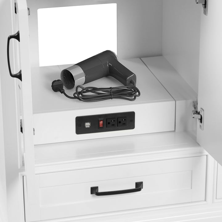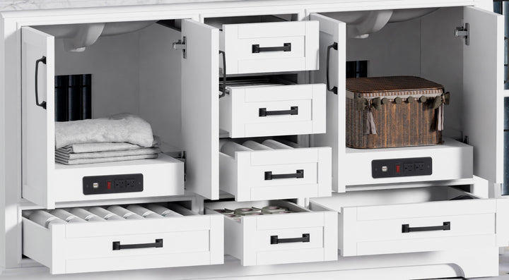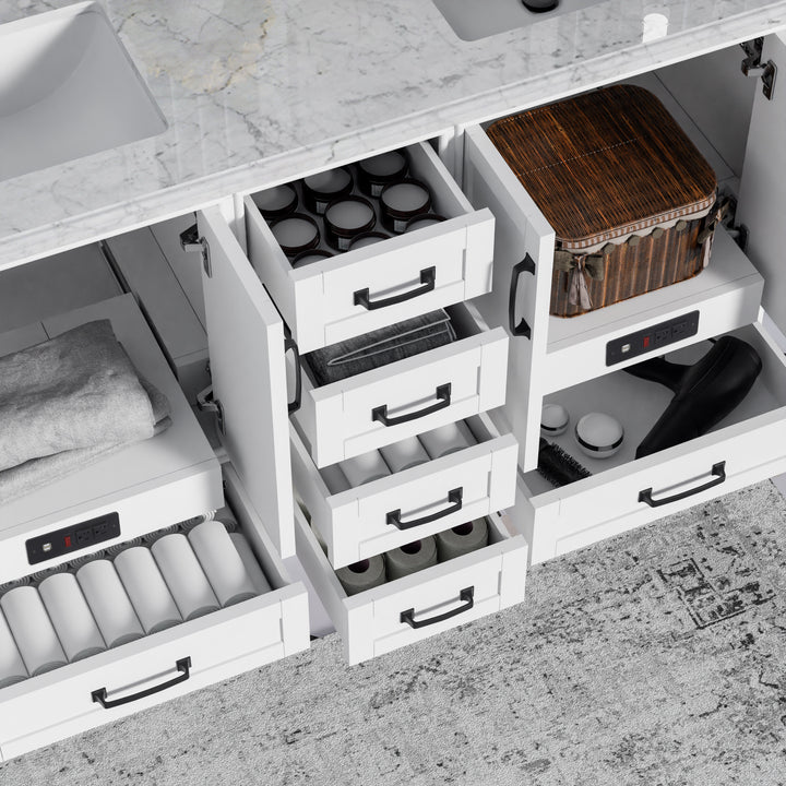 Perfect for shared spaces, the vanity features six soft-closing drawers and four soft-closing doors, offering ample, well-organized storage. Inside, you'll find integrated power outlets and USB ports, allowing for clutter-free charging and powering of grooming tools—all while keeping cords out of sight.