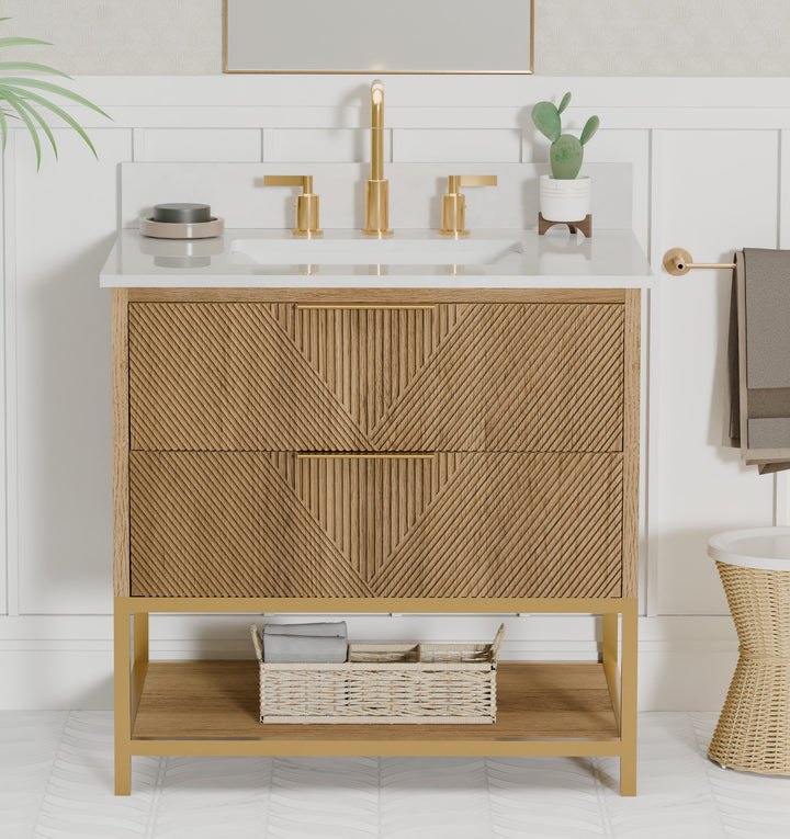 The pure white quartz top and 4-inch backsplash offer a crisp, refined surface that resists stains, moisture, and daily wear, blending durability with high-end appeal. (For vanity combos, the countertop is typically 1 inch wider than the base—about 0.5 inch overhang on each side. This standard design ensures a proper fit and finished look.)Crafted from a solid wood frame supported by a brushed gold metal base, the vanity pairs a brown oak finish with gleaming metallic details for a polished, designer-inspired look.
