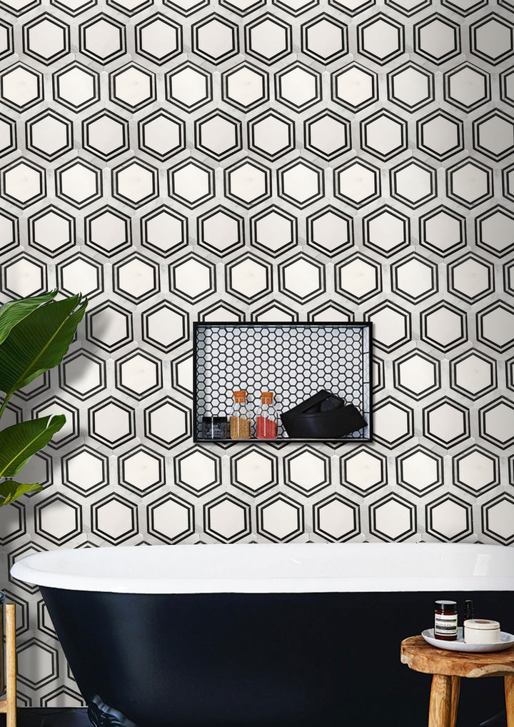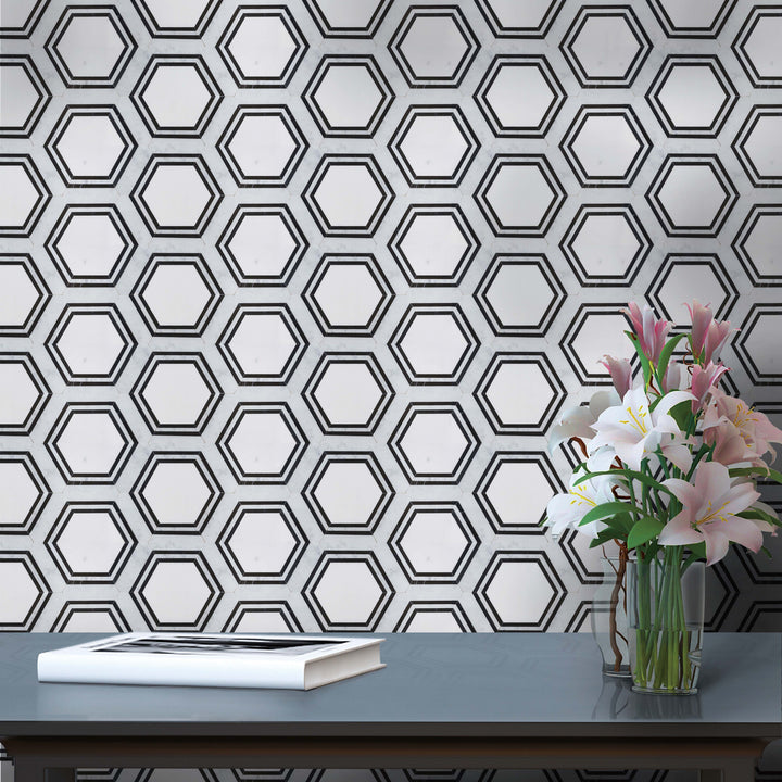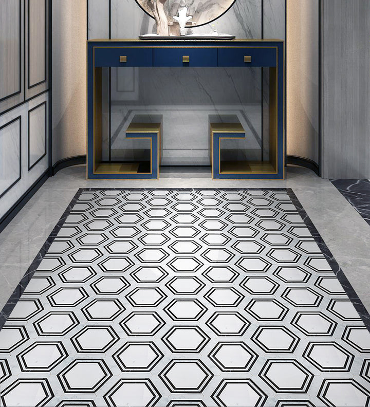 Create a sleek, bold look in any room with the Black & White Hexagon Waterjet Mosaic—where sophistication meets durability.