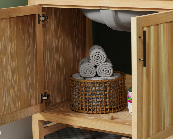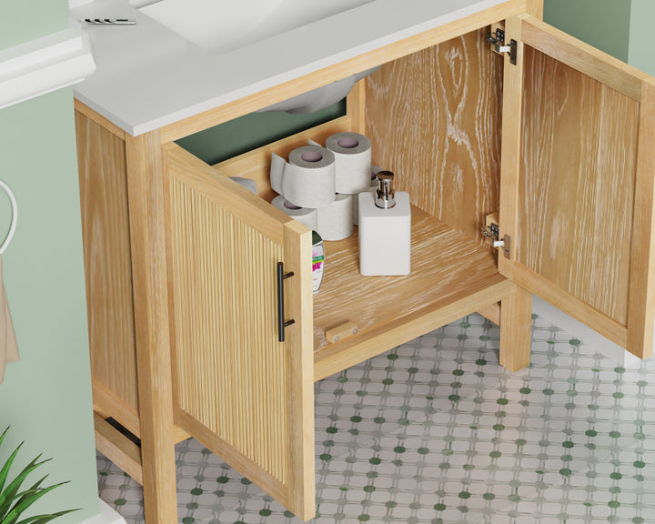 Smart storage is delivered through two soft-closing doors that preserve a clean look while preventing slams. Matte black handles offer a subtle contrast, while adjustable feet help level the vanity on uneven floors for a secure, custom fit.