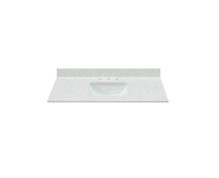 Each vanity top includes a pre-attached rectangular porcelain sink and a matching quartz backsplash for a cohesive and refined finish. Widths are available in multiple sizes to fit a wide range of vanity bases, and a matching side splash is available separately for added protection.