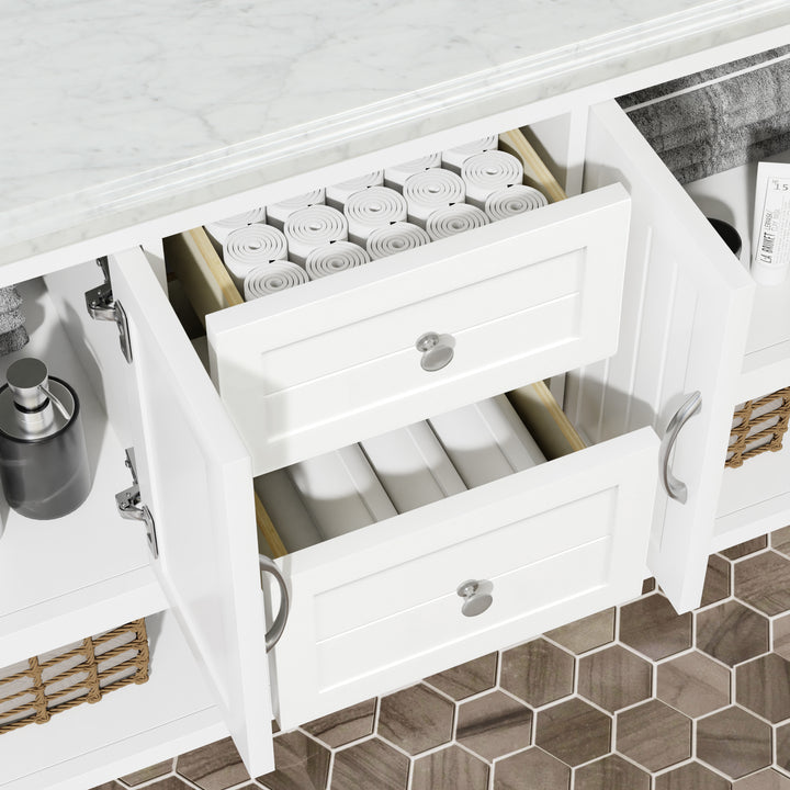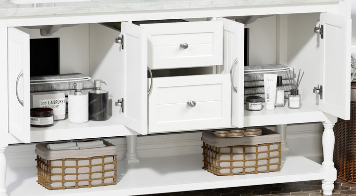 Designed for both style and practicality, the vanity includes four soft-closing doors, two soft-closing drawers, and a full-length open storage shelf—perfect for neatly displaying towels or decorative accents. The brushed nickel handles add a subtle metallic accent that complements the marble veining and painted finish.