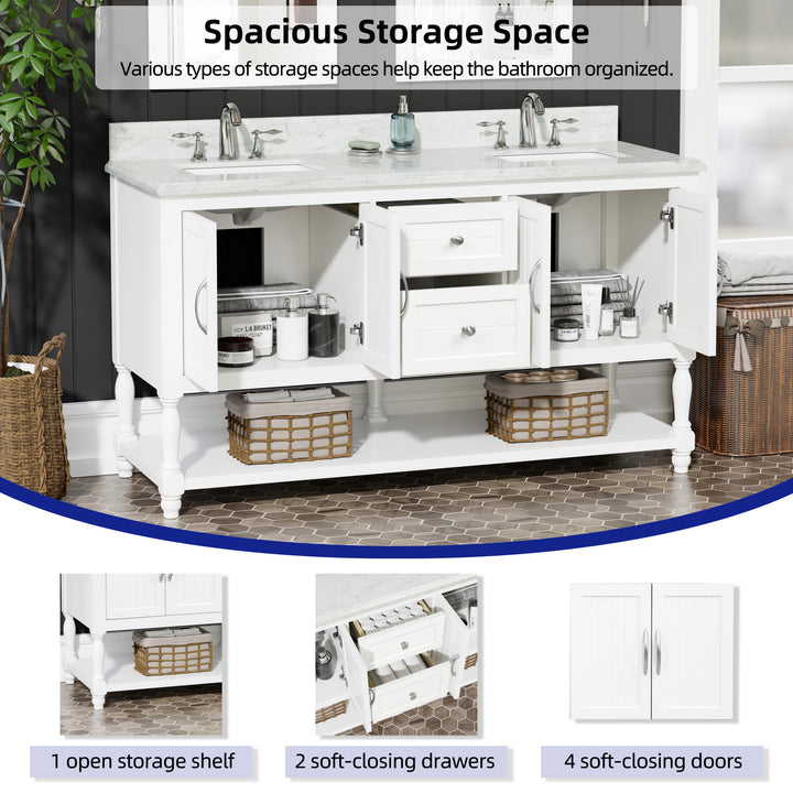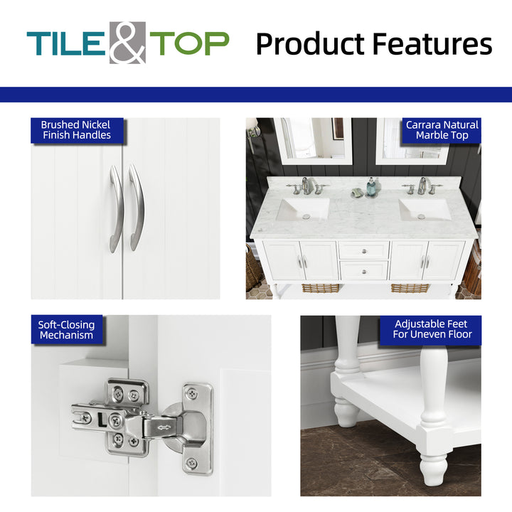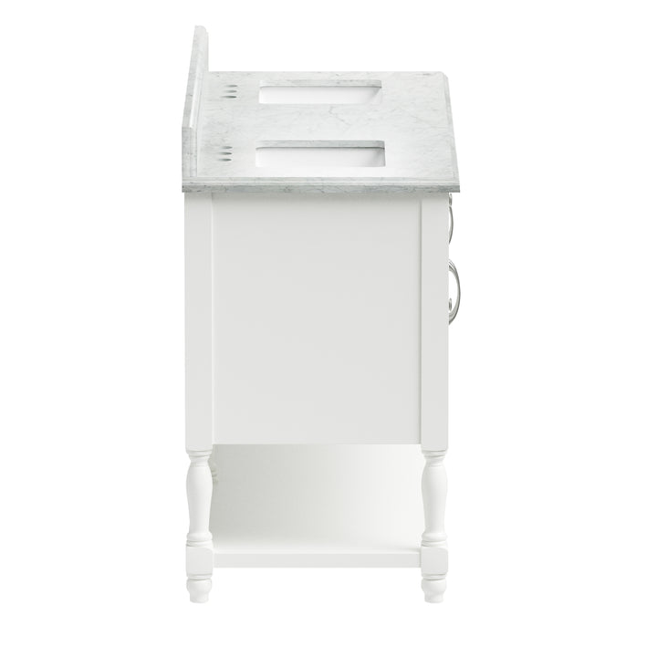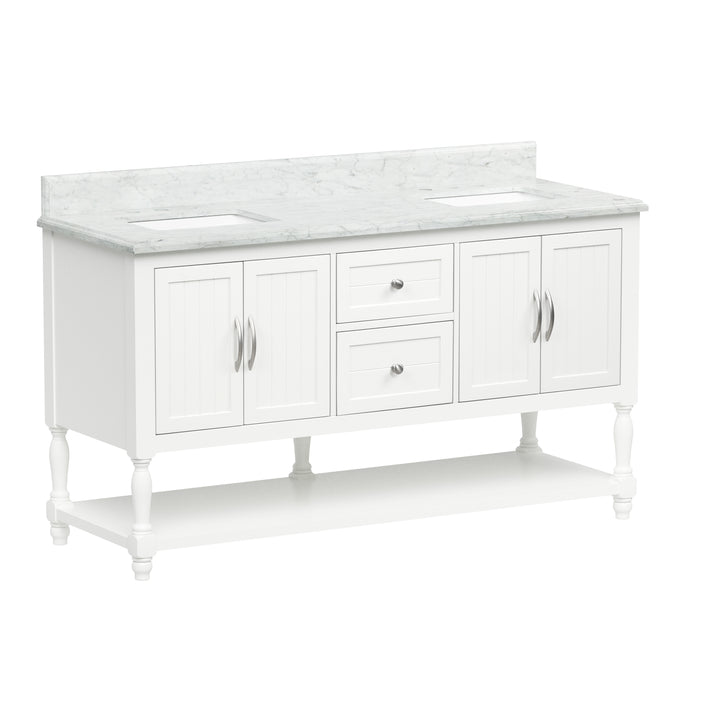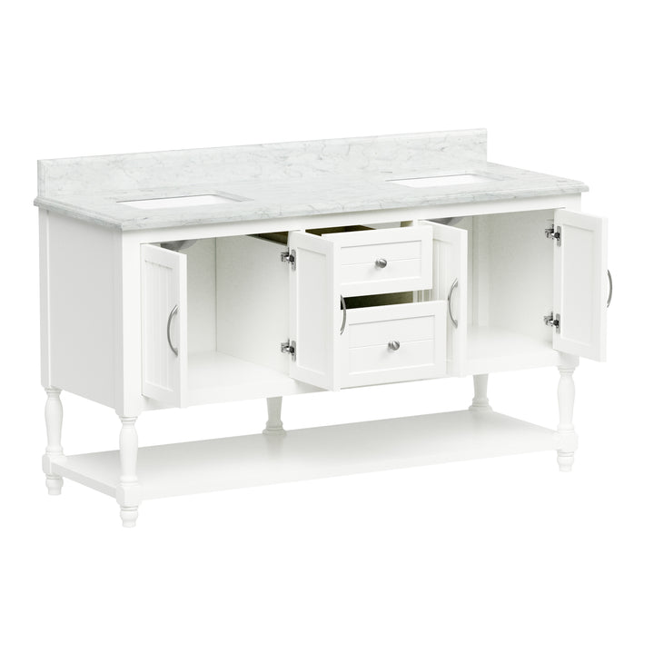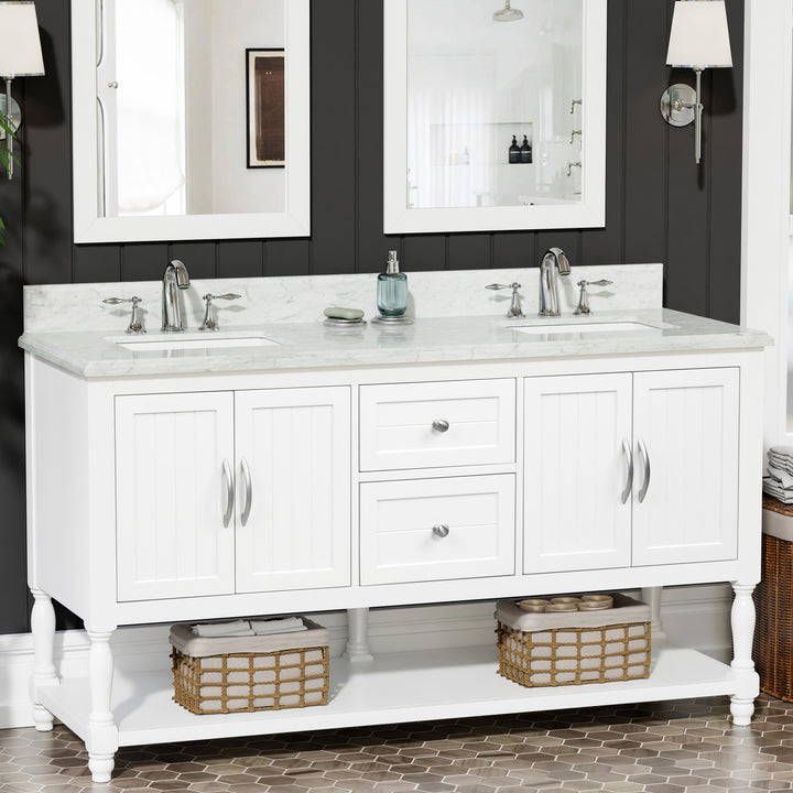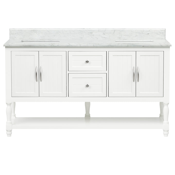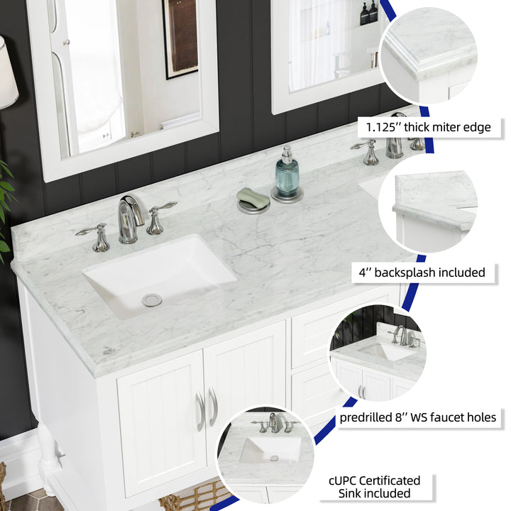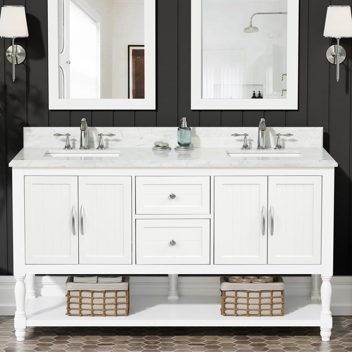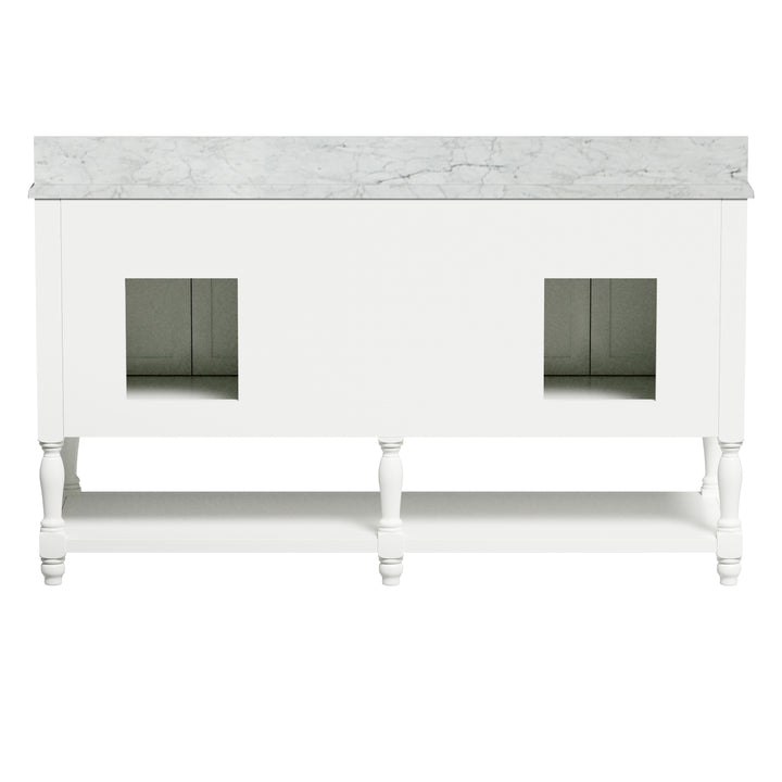 Bring timeless sophistication to your bathroom with the Camden 60" Bathroom Vanity, expertly crafted with a solid wood frame and finished in clean, bright white paint. Topped with a luxurious 1" thick premium Carrara natural marble countertop and a 4" high backsplash, this vanity delivers lasting beauty and functionality in one refined centerpiece. (For vanity combos, the countertop is typically 1 inch wider than the base—about 0.5 inch overhang on each side. This standard design ensures a proper fit and finished look.)