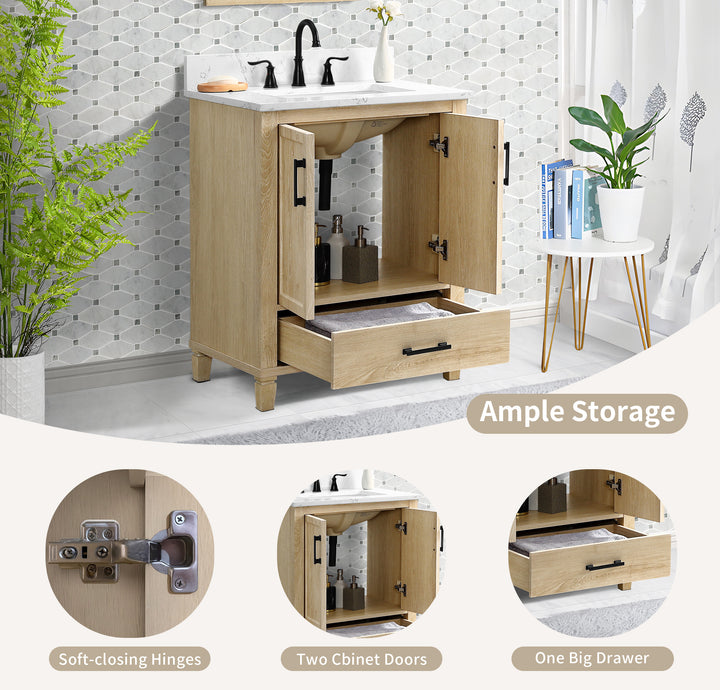 Perfect for smaller bathrooms or guest spaces, the Hardin 24" Single Bathroom Vanity brings together light wood tones, soft-close functionality, and stone-inspired elegance in one thoughtfully crafted piece. Compact in size but rich in detail, it’s the ideal combination of utility and style.