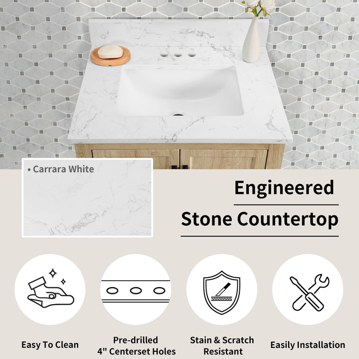 Topped with a Carrara white engineered stone surface and a 4-inch backsplash, the vanity offers the look of natural marble with added resilience, resisting stains, moisture, and everyday wear. (For vanity combos, the countertop is typically 1 inch wider than the base—about 0.5 inch overhang on each side. This standard design ensures a proper fit and a finished look.) The MDF frame is finished in RTF light wood tone, accented with solid wood feet for enhanced stability and a more elevated appearance.
