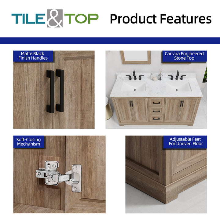 The wide Carrara engineered stone countertop replicates the timeless beauty of marble while offering excellent resistance to stains, moisture, and daily wear. A 4-inch matching backsplash ensures splash protection and a seamless visual transition. (For vanity combos, the countertop is typically 1 inch wider than the base—about 0.5 inch overhang on each side. This standard design ensures a proper fit and finished look.) The MDF frame wrapped in a light wood grain paper finish balances visual warmth with practical durability.