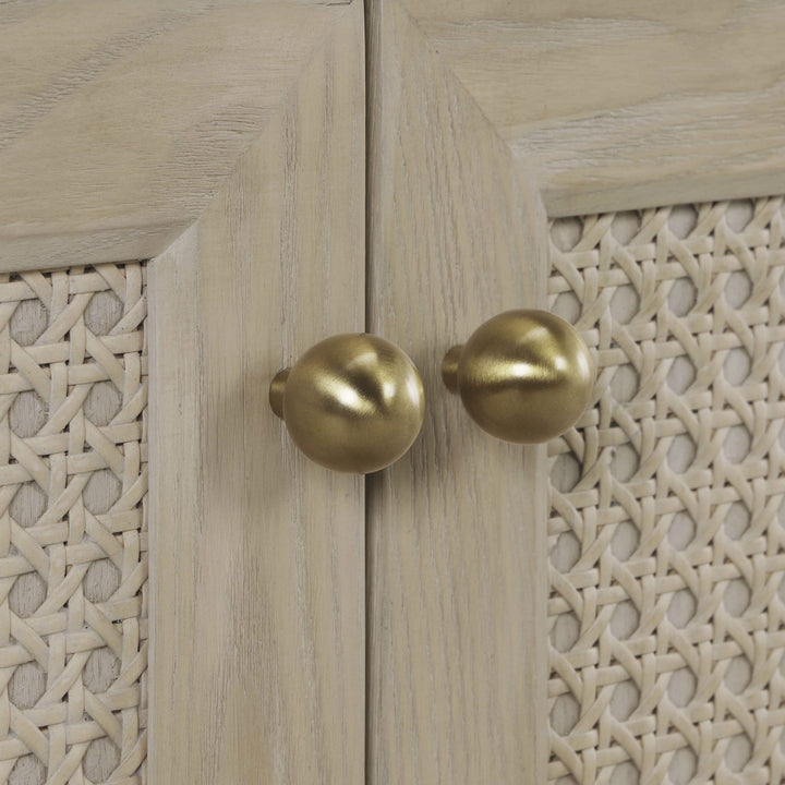 • Material: Light oak finish with cane detailing on the cabinet doors