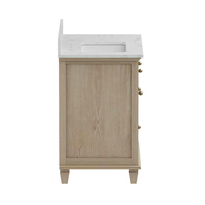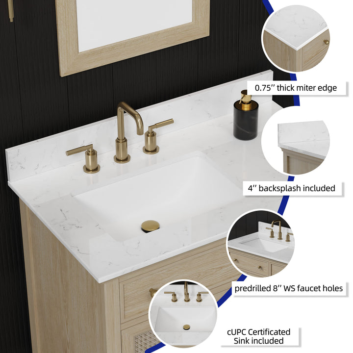 The vanity is topped with a white Carrara quartz countertop, offering the luxurious look of marble with superior durability and stain resistance. A rectangular porcelain sink is seamlessly integrated for easy maintenance, while the included 4-inch backsplash adds both style and splash protection. (For vanity combos, the countertop is typically 1 inch wider than the base—about 0.5 inch overhang on each side. This standard design ensures a proper fit and a finished look.) The top is pre-drilled for an 8" widespread faucet, giving you flexibility in fixture selection.