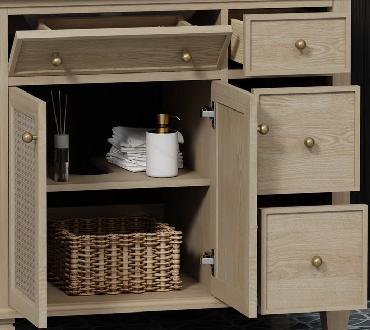 Introduce natural elegance and handcrafted charm to your bathroom with the Ronnie Vanity Set—a standout piece from the Ronnie Vanity Family, inspired by the organic interior trends of 2024. Finished in a calming light oak tone and featuring cane-front doors, this vanity blends artisanal texture with modern lines, creating a refined focal point for any contemporary space.