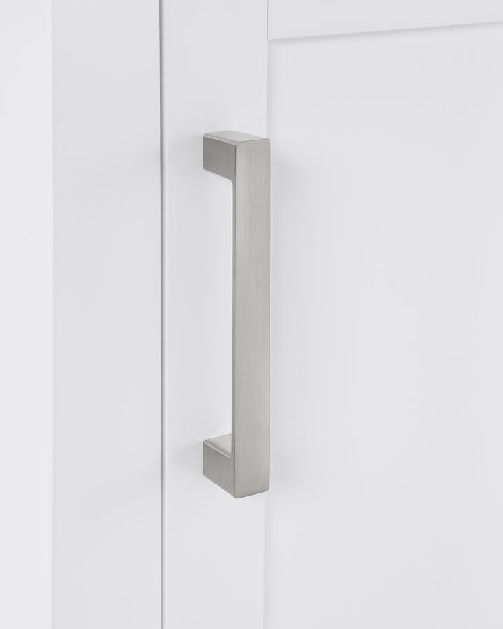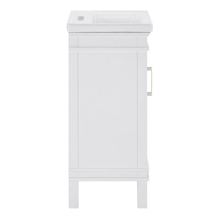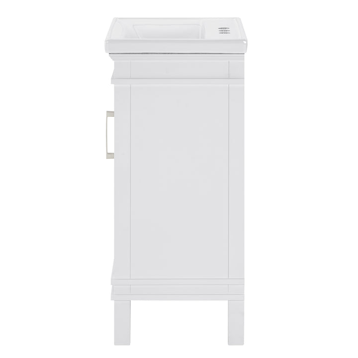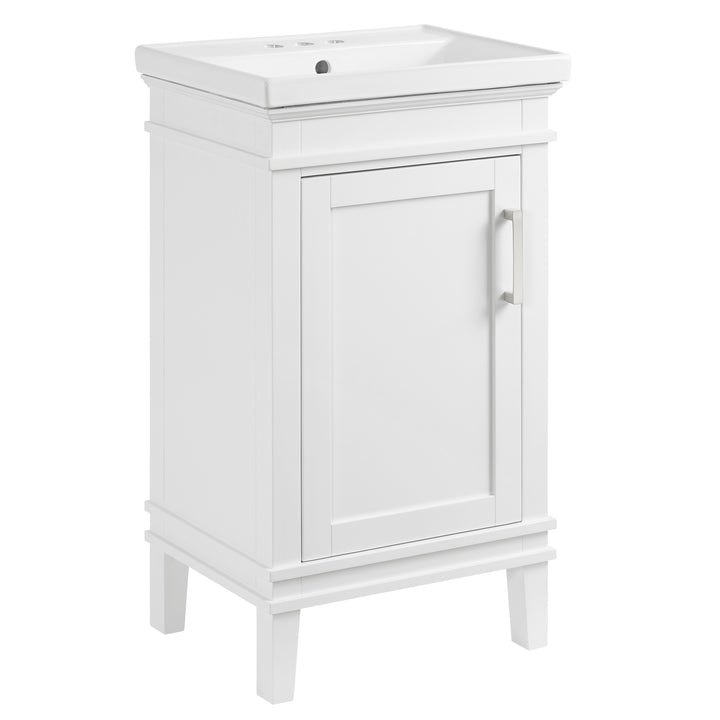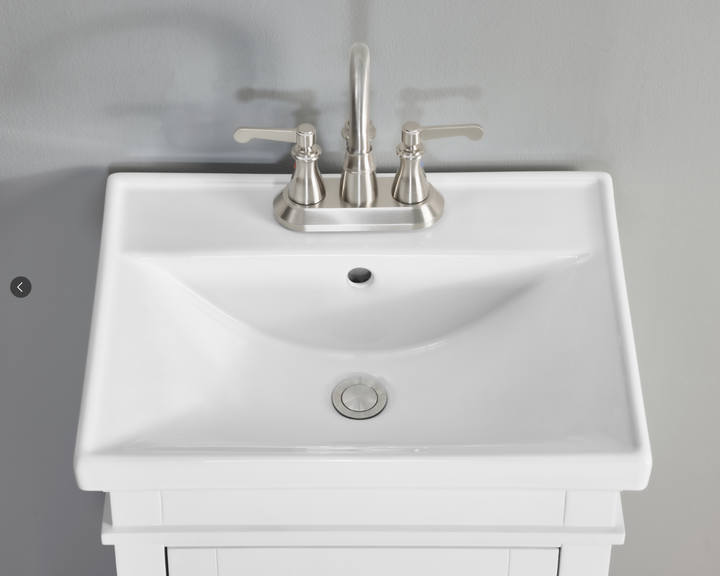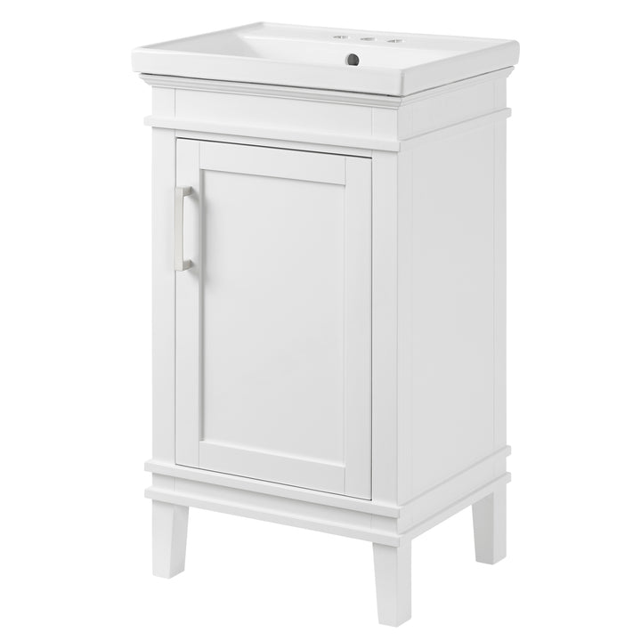 Crafted with durability in mind, the vanity features a white porcelain top with integrated basin for seamless cleaning and daily use. The Swan White finish base offers a crisp, versatile look, while brushed nickel hardware provides a subtle contemporary accent. Pre-drilled for a 4-inch centerset faucet (sold separately), the Elmington is ready to install and enjoy from day one.