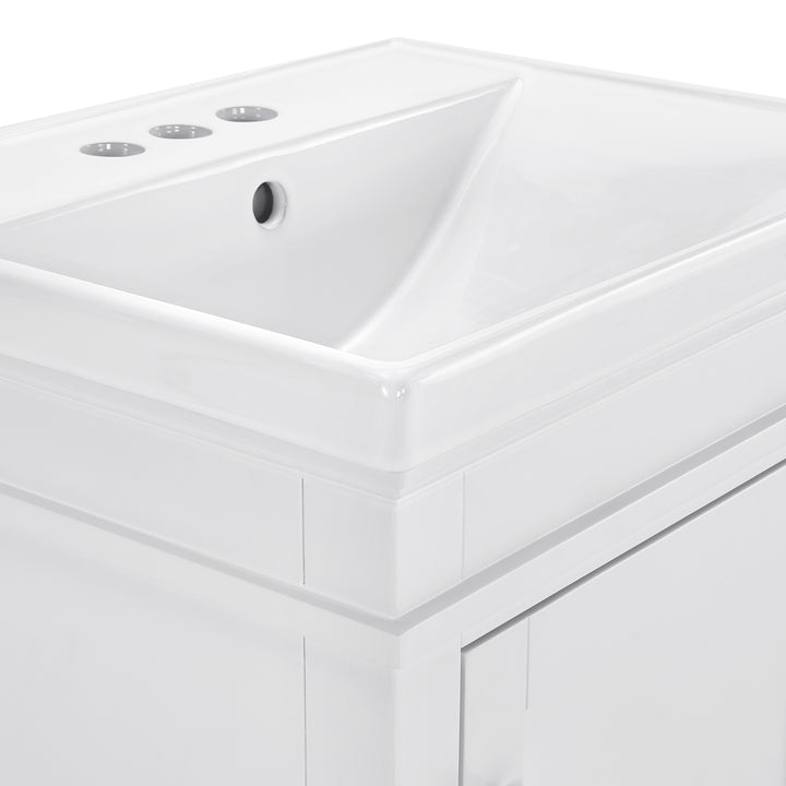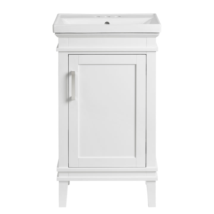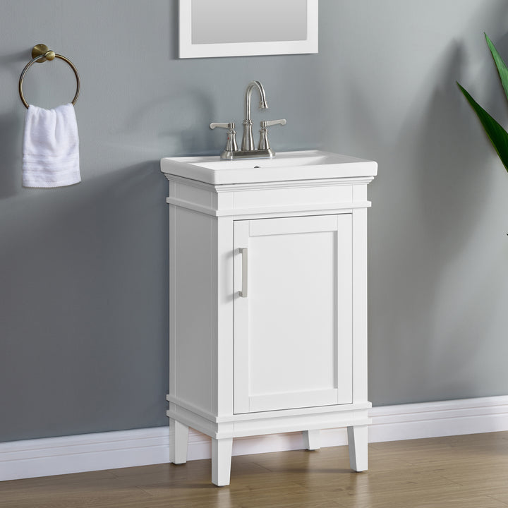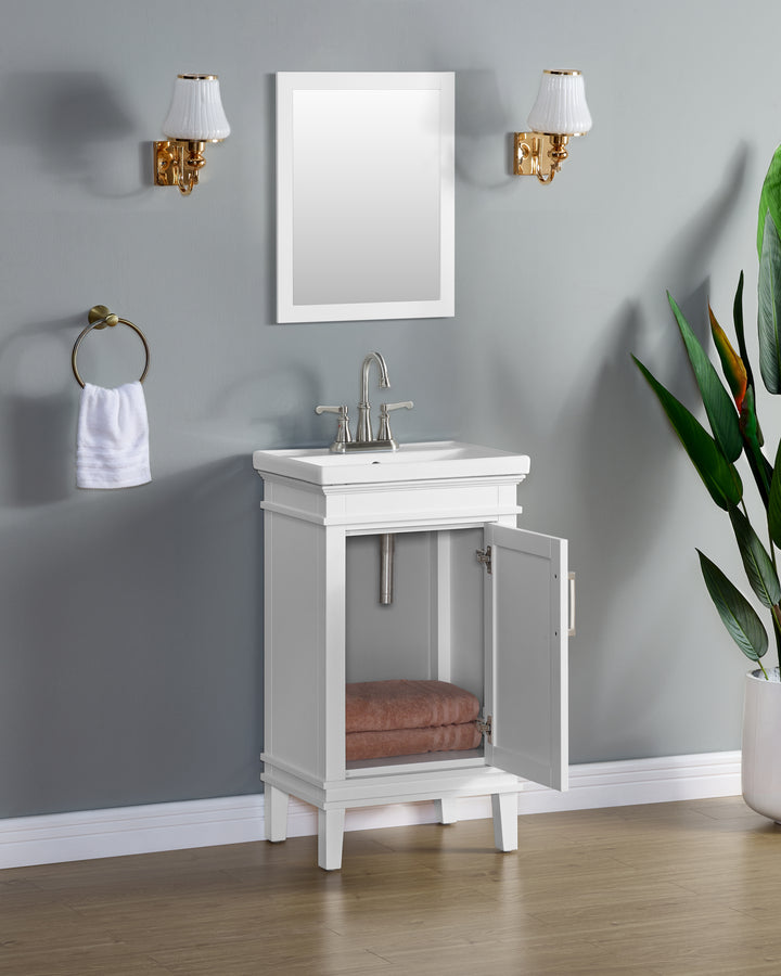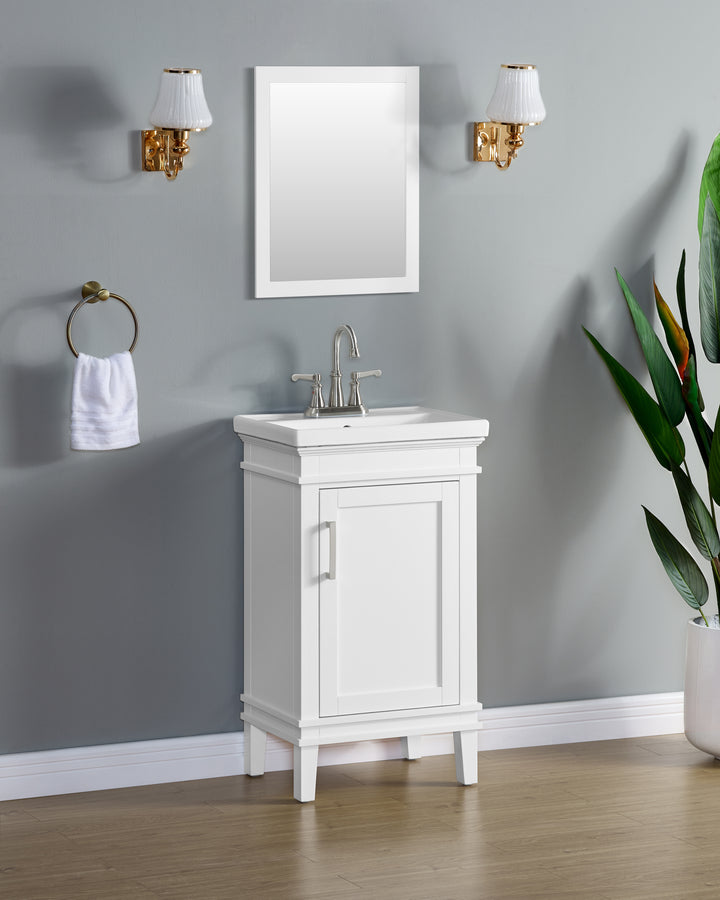 Designed for powder rooms, guest baths, and cozy urban apartments, the Elmington 20" Vanity combines a fresh Swan White finish with space-saving intelligence. Compact yet complete, this vanity brings instant style and function to any small bathroom—right out of the box.