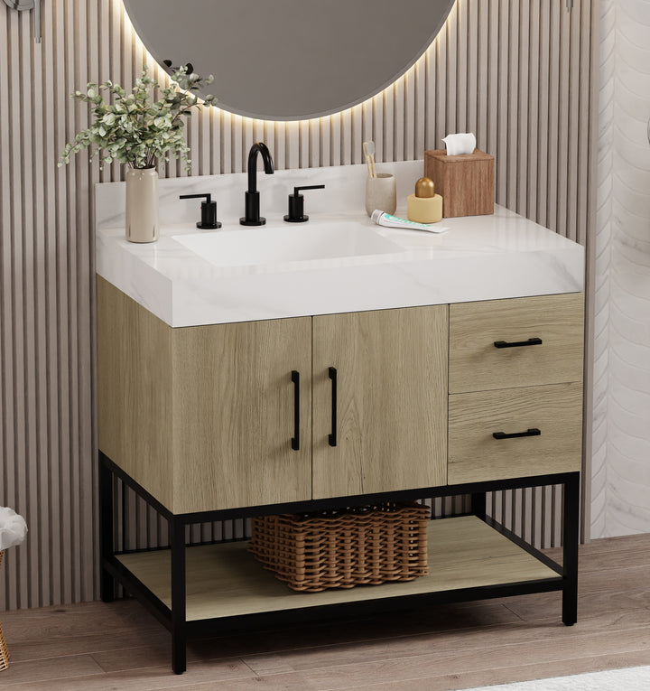 Elevate your bathroom space with the sophisticated style and practical innovation of the Utopia 37" Vanity. Combining the striking beauty of Calacatta sintered stone with the durability of a metal-reinforced frame, this vanity brings a luxurious yet functional centerpiece to any contemporary bathroom.