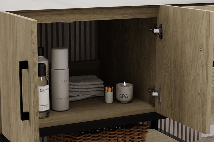 - Storage: 2 soft-closing drawers + 2 soft-closing doors + 1 open metal shelf